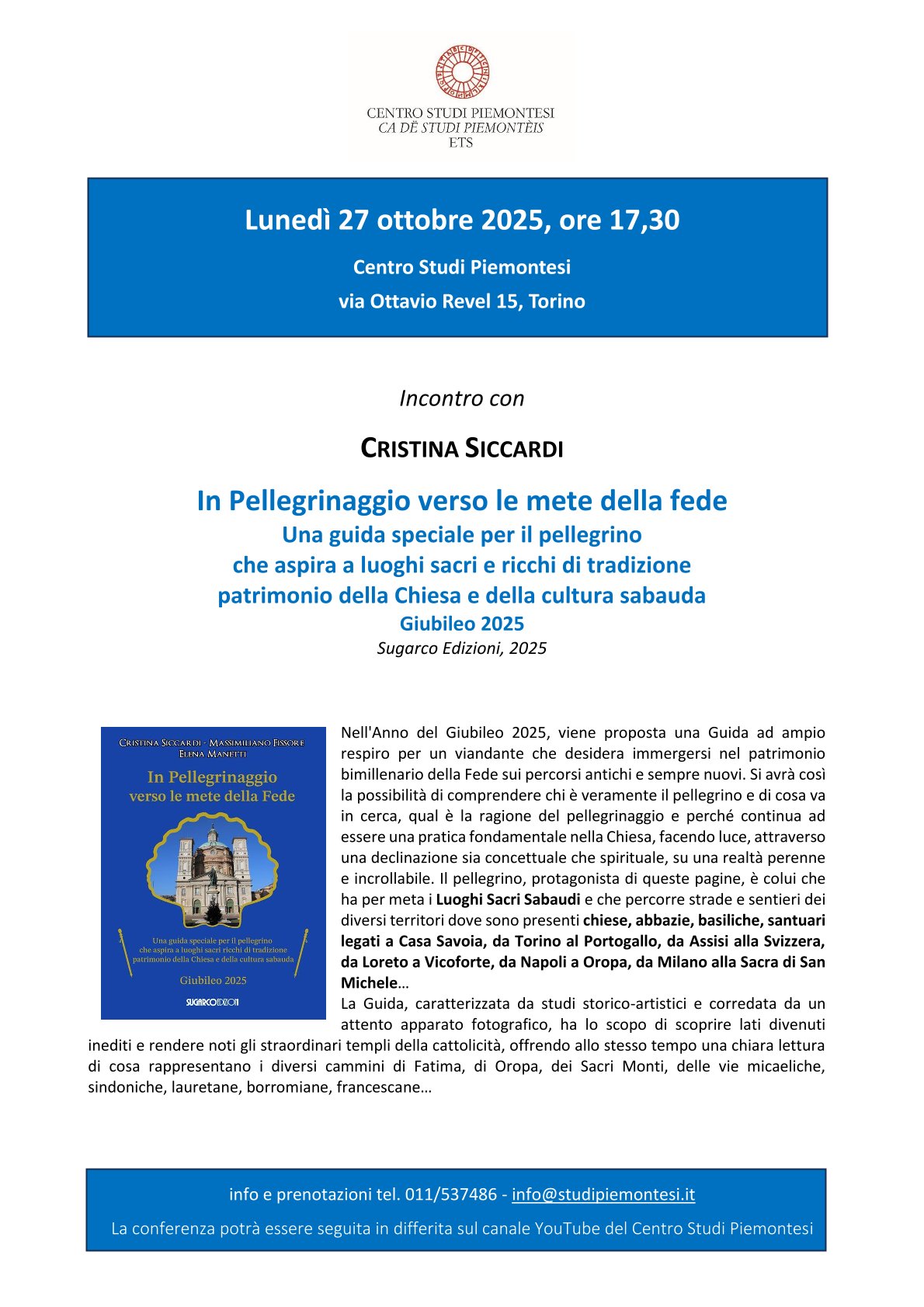 TORINO, 27 ottobre 2025, ore 17,30 – Centro Studi Piemontesi, via Ottavio Revel 15 – Incontro con Cristina Siccardi e presentazione del suo libro “In pellegrinaggio verso le mete della fede. Una guida speciale per il pellegrino che aspira a luoghi sacri e ricchi di tradizione patrimonio della Chiesa e della cultura sabauda. Giubileo 2025”.